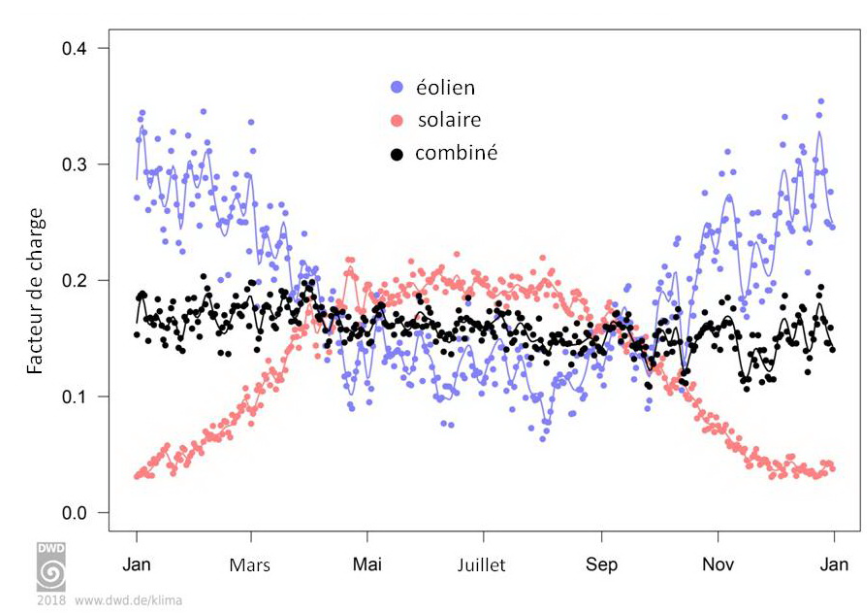 Une étude du service météorologique allemand DWD(15) illustre cela pour le solaire et l’éolien (cf. figure ci-dessous). La géothermie et les bioénergies permettent des synergies supplémentaires, tant en termes de profil de production qu’en termes de vulnérabilité aux risques.