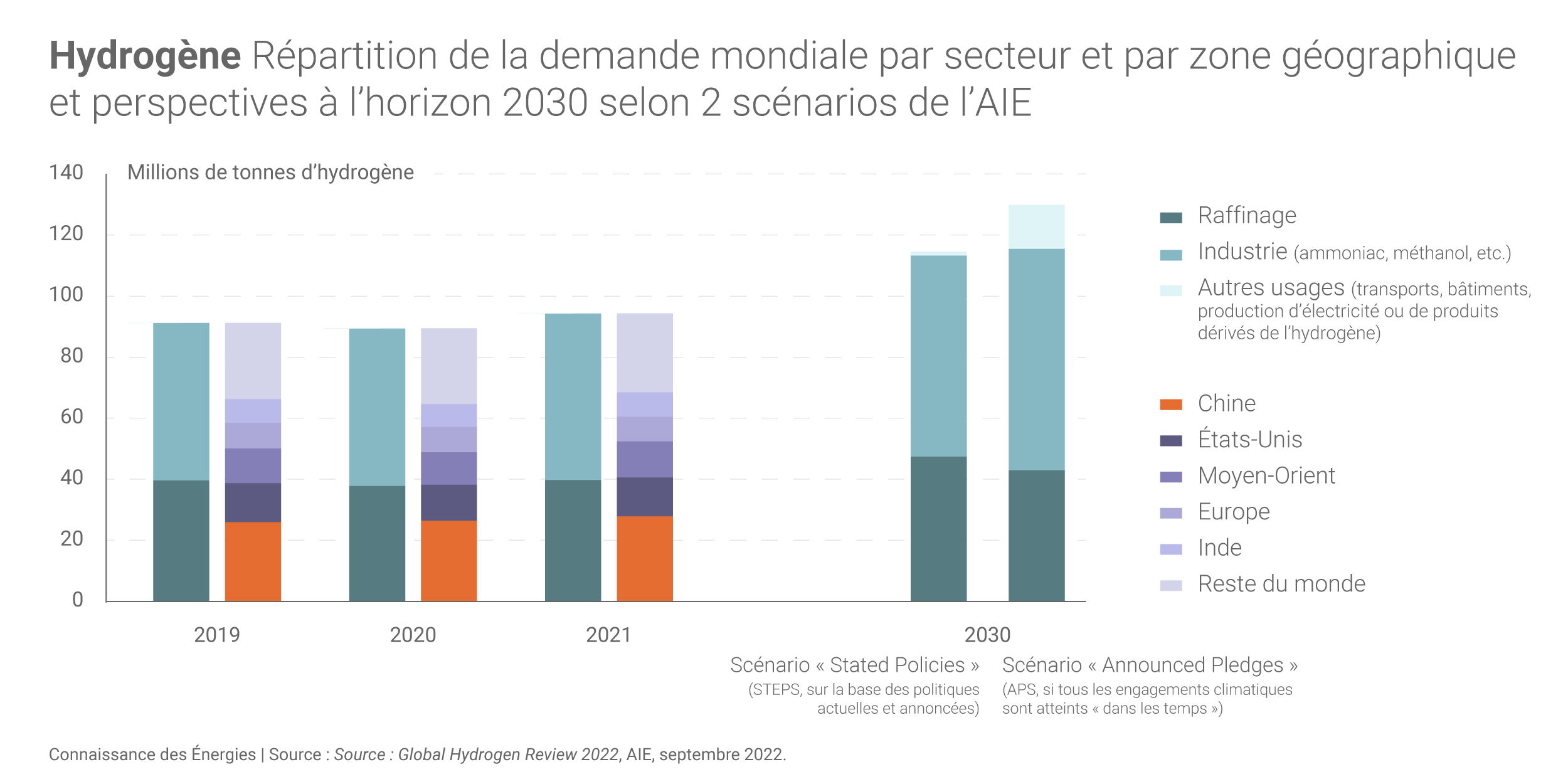 En 2021, la consommation mondiale d'hydrogène s'est élevée à 94 millions de tonnes (Mt) selon l'AIE, un record (le précédent pic de la demande atteint en 2019 était de 91 Mt). Mais la hausse de la demande concerne en grande majorité des « utilisations traditionnelles de l'hydrogène dans le raffinage et l'industrie », précise l'Agence.