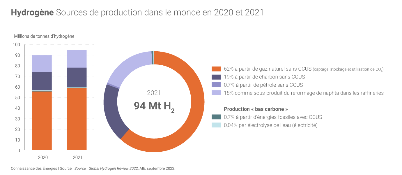 La croissance de la consommation mondiale d'hydrogène en 2021 a par ailleurs été largement satisfaite par une production supplémentaire d'hydrogène à partir d'énergies fossiles sans captage du CO2. Autrement dit, elle n'a pas « pas présenté d'avantage pour atténuer les changements climatiques ». En 2021, la production d'hydrogène « bas carbone » (principalement à partir d'énergies fossiles mais avec captage du CO2) s'est limitée à moins d'un million de tonnes, même si de nouveaux projets se développent à « une vitesse impressionnante », indique l'AIE.