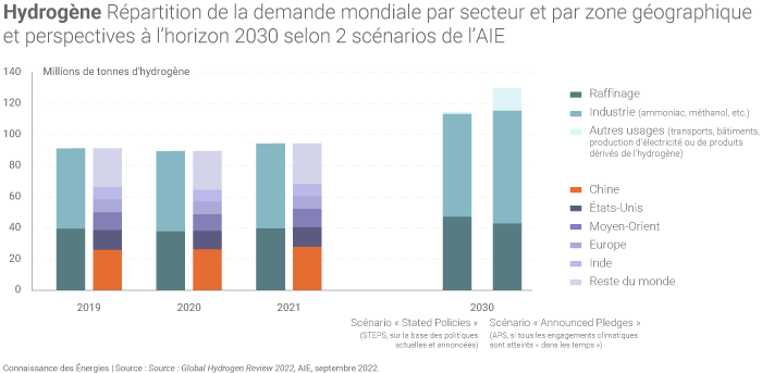 En 2021, la consommation mondiale d'hydrogène s'est élevée à 94 millions de tonnes (Mt) selon l'AIE, un record (le précédent pic de la demande atteint en 2019 était de 91 Mt). Mais la hausse de la demande concerne en grande majorité des « utilisations traditionnelles de l'hydrogène dans le raffinage et l'industrie », précise l'Agence.