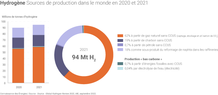 La croissance de la consommation mondiale d'hydrogène en 2021 a par ailleurs été largement satisfaite par une production supplémentaire d'hydrogène à partir d'énergies fossiles sans captage du CO2. Autrement dit, elle n'a pas « pas présenté d'avantage pour atténuer les changements climatiques ». En 2021, la production d'hydrogène « bas carbone » (principalement à partir d'énergies fossiles mais avec captage du CO2) s'est limitée à moins d'un million de tonnes, même si de nouveaux projets se développent à « une vitesse impressionnante », indique l'AIE.