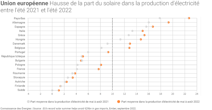 La part du solaire dans la production électrique a atteint un niveau record dans 18 des 27 États membres de l'UE. Elle a été supérieure à 10% dans 10 de ces pays, en particulier aux Pays-Bas (où le solaire a compté pour 22,7% de la production électrique entre mai et août 2022), en Allemagne (19,3%) et en Espagne (16,7%). La part du solaire s'est en revanche limitée à 7,7% dans le mix électrique français durant la période considérée.