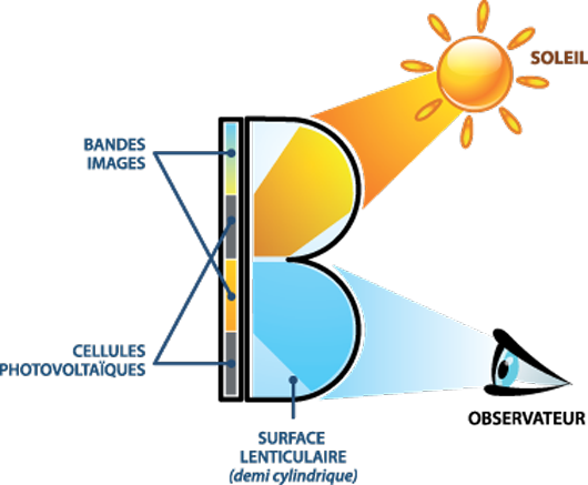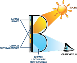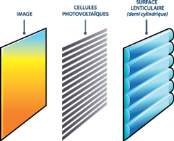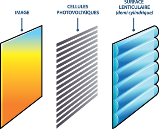 La technologie développée par Wysips se base sur un principe d’optique. Elle utilise un ensemble de microlentilles(1) qui permettent de concentrer la lumière vers de minces bandes de cellules photovoltaïques. Le capteur solaire capte ainsi la lumière sous un certain angle tandis que l’observateur conserve une vision transparente de son image sous un autre angle.