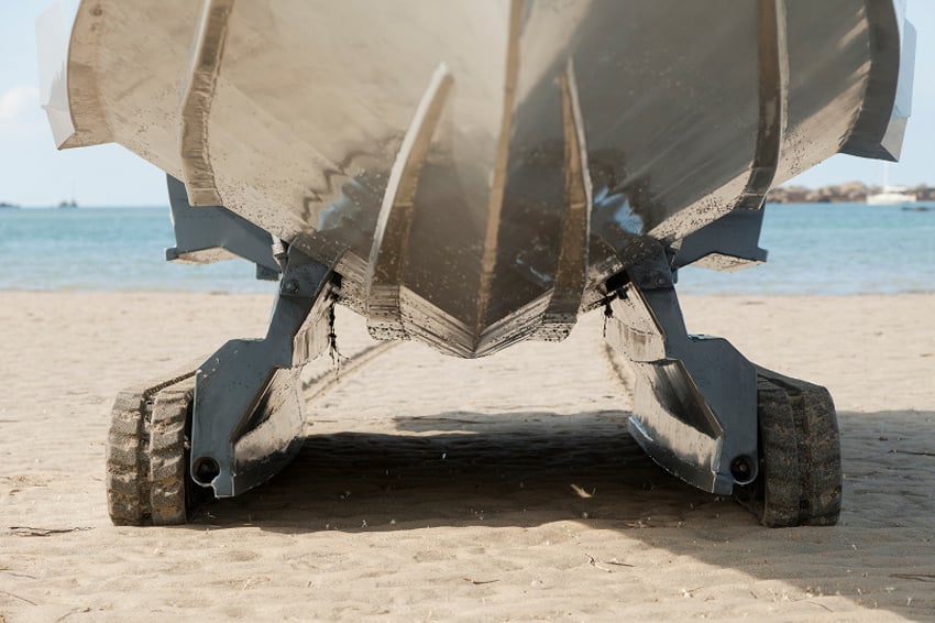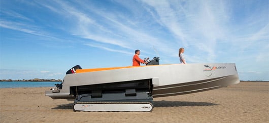 Concrètement, deux chenilles parallèles au sol permettent la mobilité terrestre du bateau sur terrain mou comme en pente, à vitesse réduite (plafonnée à 8 km/h). L’Iguana 29 est ainsi capable de traverser des bancs de sable sans s’enliser et de remonter les plages sans assistance.