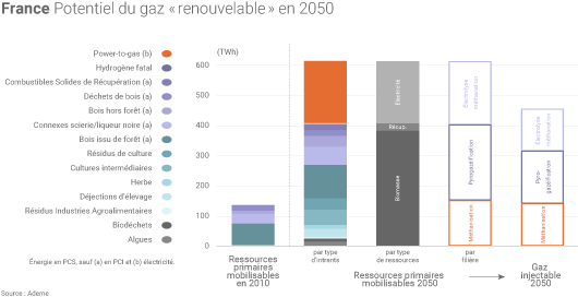 En 2050, la demande finale française de « gaz en réseau » pourrait avoisiner 300 TWh en 2050 (contre 460 TWh par an à l’heure actuelle) grâce aux efforts d’efficacité et de sobriété, selon les prévisions de l’Ademe(1). D’ici là, les filières de production de gaz dit « renouvelable » (méthanisation, pyrogazéification et Power-to-gas) pourraient connaître un très fort développement.