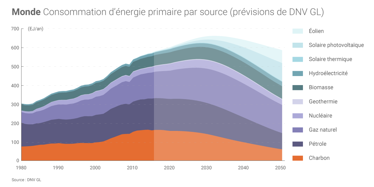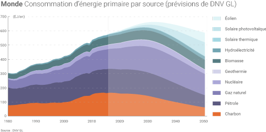 Dans ses prévisions, DNV GL voit la consommation mondiale de pétrole culminer en 2023(2), le gaz naturel devenant la première source d’énergie à partir de 2026. Les énergies fossiles pourraient encore compter pour près de la moitié du mix énergétique mondial en 2050 (25% pour le seul gaz naturel) selon DNV GL, contre plus de 80% à l’heure actuelle.