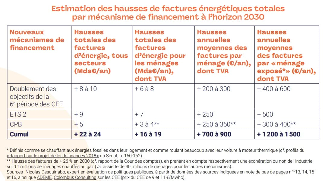 Concrètement, ces dispositifs pourraient, à l'horizon 2030, augmenter les factures d'énergie des ménages français « les plus exposés » (se chauffant aux énergies fossiles dans leur logement et roulant beaucoup avec leur voiture à moteur thermique) de 1 200 euros à 1 500 euros par an, selon le réseau Cler (avec un impact de 300 à 600 euros par an dû à chacun des 3 mécanismes). En moyenne, cette hausse de facture pour un ménage français pourrait atteindre 700 à 900 euros par an, précise l'association.