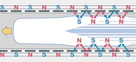 Méthode de propulsion du « maglev » japonais par attraction et répulsion entre les bobines supraconductrices et les électroaimants (©US-Japan Maglev)
