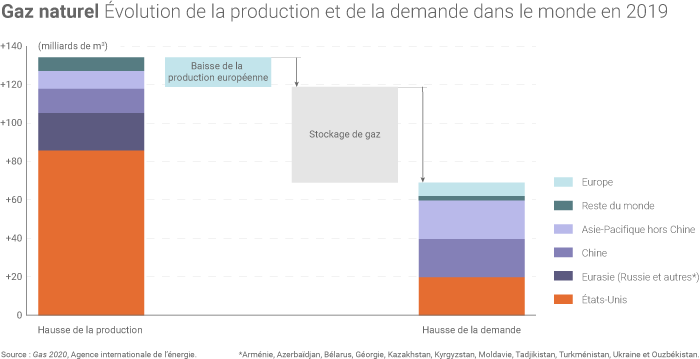 En 2019, la consommation mondiale de gaz naturel avait progressé de 1,8% par rapport au niveau de 2018 (soit approximativement la hausse annuelle moyenne de la demande gazière sur la période 2010-2017). Les États-Unis et la Chine avaient compté à eux seuls pour les deux tiers de la hausse de la demande l'an dernier.
