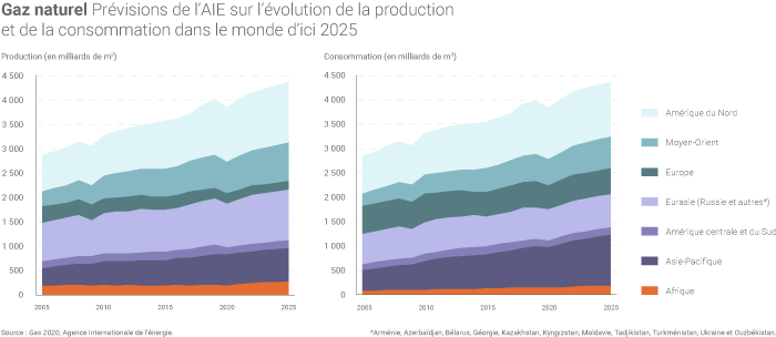 Précisons que la chute de la consommation mondiale de gaz envisagée par l'AIE en 2020 est sensiblement moins forte que celle de pétrole et de charbon. L'AIE prévoit une « remontée progressive » de la demande gazière dans les deux prochaines années plutôt qu'un rapide « retour à la normale ».