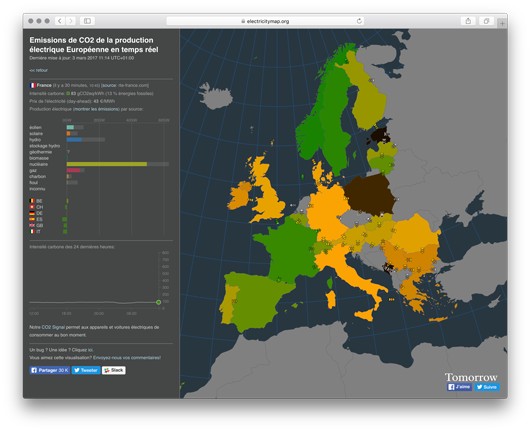 Le 3 mars 2017 à 11h, la France était colorée en vert sur la carte du site www.electricitymap.org, conçue par la start-up danoise Tomorrow. Au même moment, l’Allemagne apparaissait en orange, la Pologne en marron foncé et l’Estonie en noir. Ces différentes couleurs(1) correspondent aux niveaux en temps réel des émissions de gaz à effet de serre (« équivalent CO2 ») associées à la production électrique dans les différents pays européens.