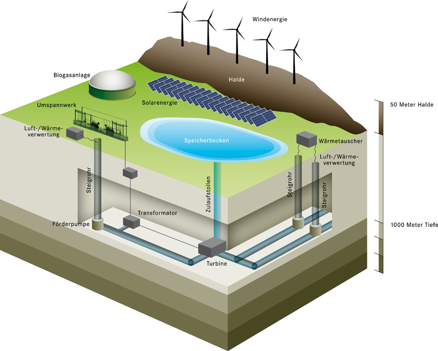 Ce principe pourrait être appliqué au sein de la mine de charbon de Prosper-Haniel en exploitant le dénivelé entre la surface et le fond de la mine, à près de 1 300 m de profondeur. Concrètement, près d’un million de mètres cubes d’eau pourrait circuler au sein de 26 kilomètres de tunnels de la mine.