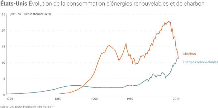 En 2019, la consommation américaine de charbon a baissé de 15% par rapport à 2018 selon l’EIA (c’est la sixième année de chute de la consommation nationale de ce combustible, qui a atteint son plus bas niveau annuel depuis 1964). Dans le même temps, la consommation d’énergies renouvelables aux États-Unis a augmenté de 1% en 2019 par rapport à 2018.