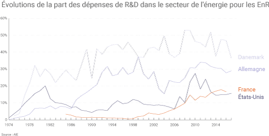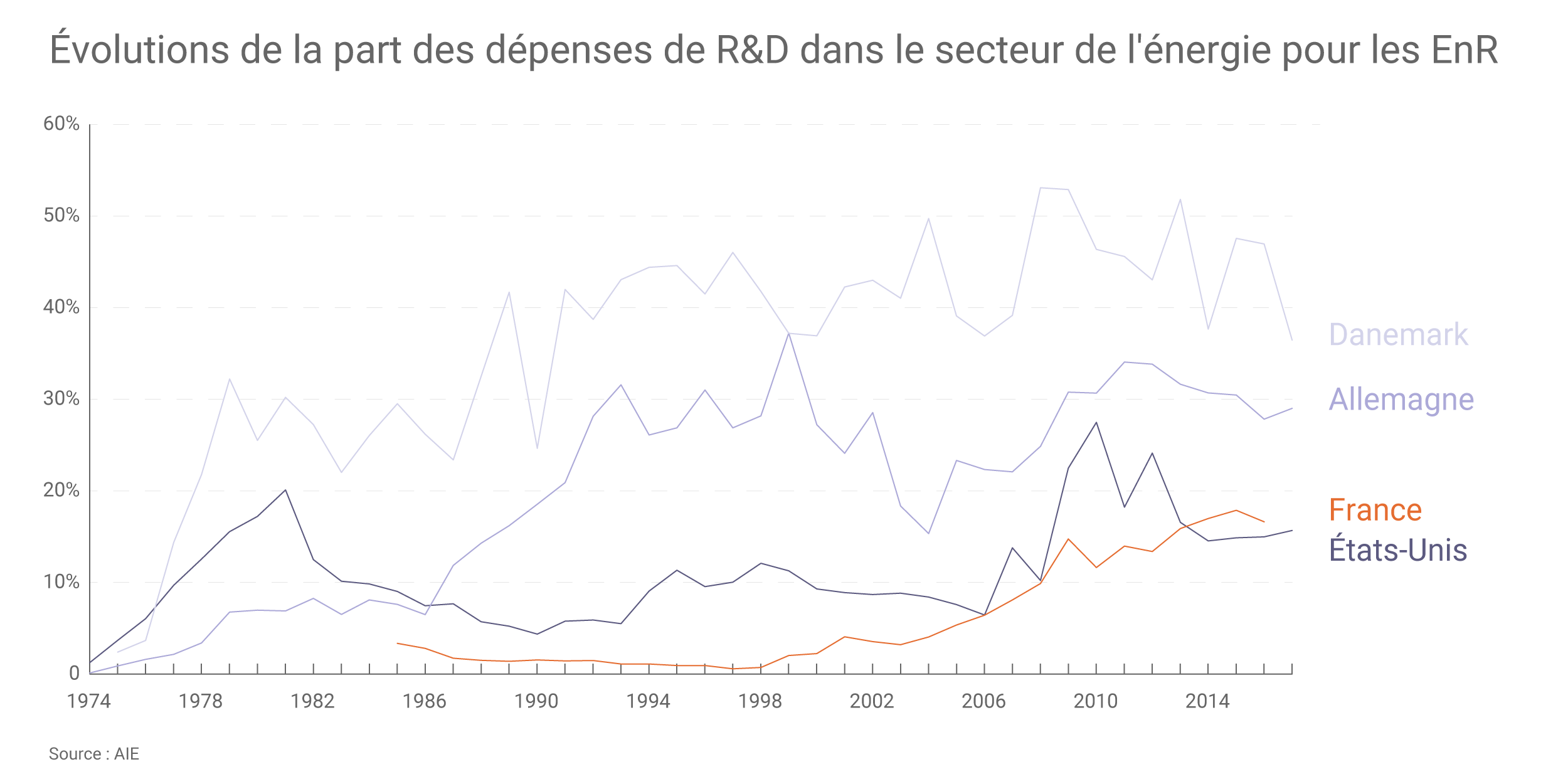 Les dépenses de R&D consacrées aux énergies renouvelables évoluent en partie en fonction des grands événements géopolitiques et énergétiques comme les chocs pétroliers des années 1970 ou l’accident de Tchernobyl en 1986. (©Connaissance des Énergies, d’après IFPEN/Iris)