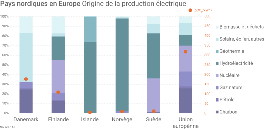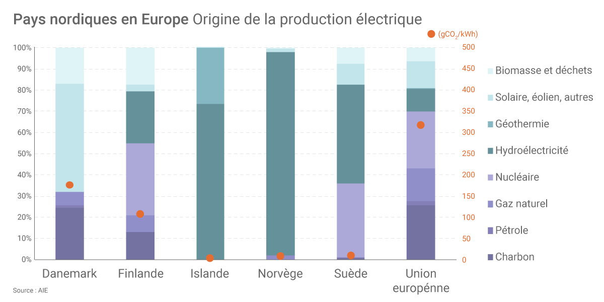 Comme en France, la production électrique est très décarbonée en Norvège et en Suède, principaux pays nordiques où se développe la mobilité électrique. (©Connaissance des Énergies, d’après AIE)