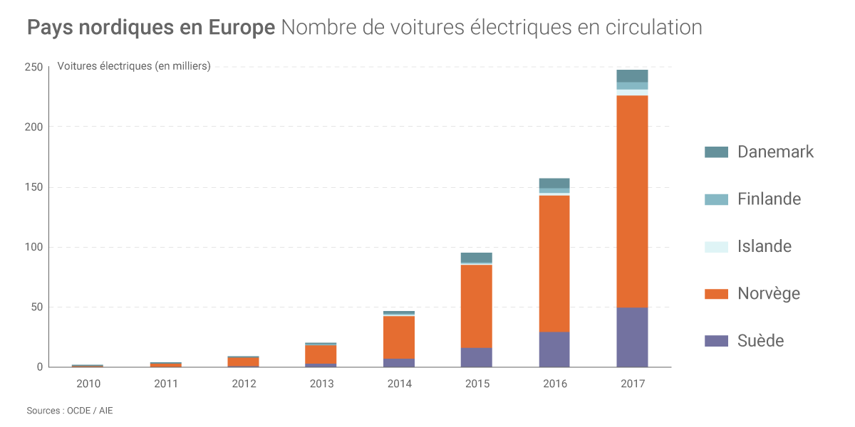 Le parc de véhicules des pays nordiques comprenait 247 000 voitures électriques à fin 2017. (©Connaissance des Énergies, d’après AIE)