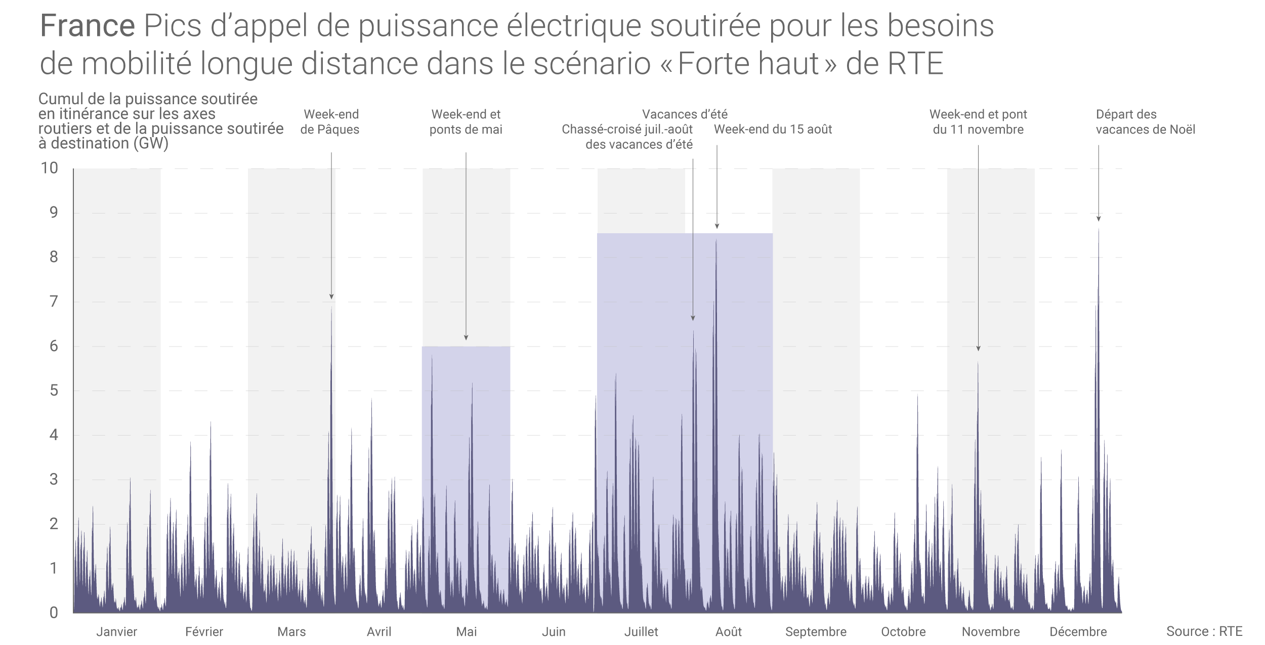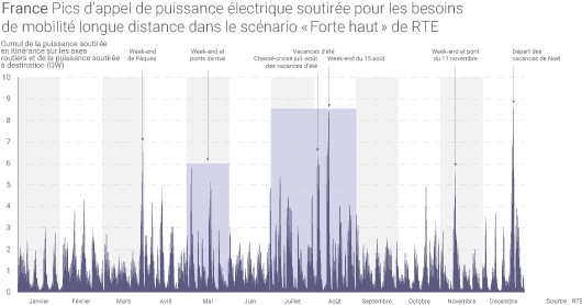 Dans le cadre du développement de l’électromobilité, RTE indique avoir constaté de nombreuses craintes portant sur les pics d’appels de puissance lors de périodes de grands déplacements, notamment les « chassés-croisés » de juillet/août et les grands week-ends de mai. Ces épisodes « ne constituent pas un motif d’inquiétude » toutefois pour le gestionnaire de réseau car ils interviennent lorsque le système électrique « dispose de marges abondantes ». Au sein des « grands déplacements », seules les vacances de Noël nécessiteraient une vigilance particulière dans un scénario de vague de froid.