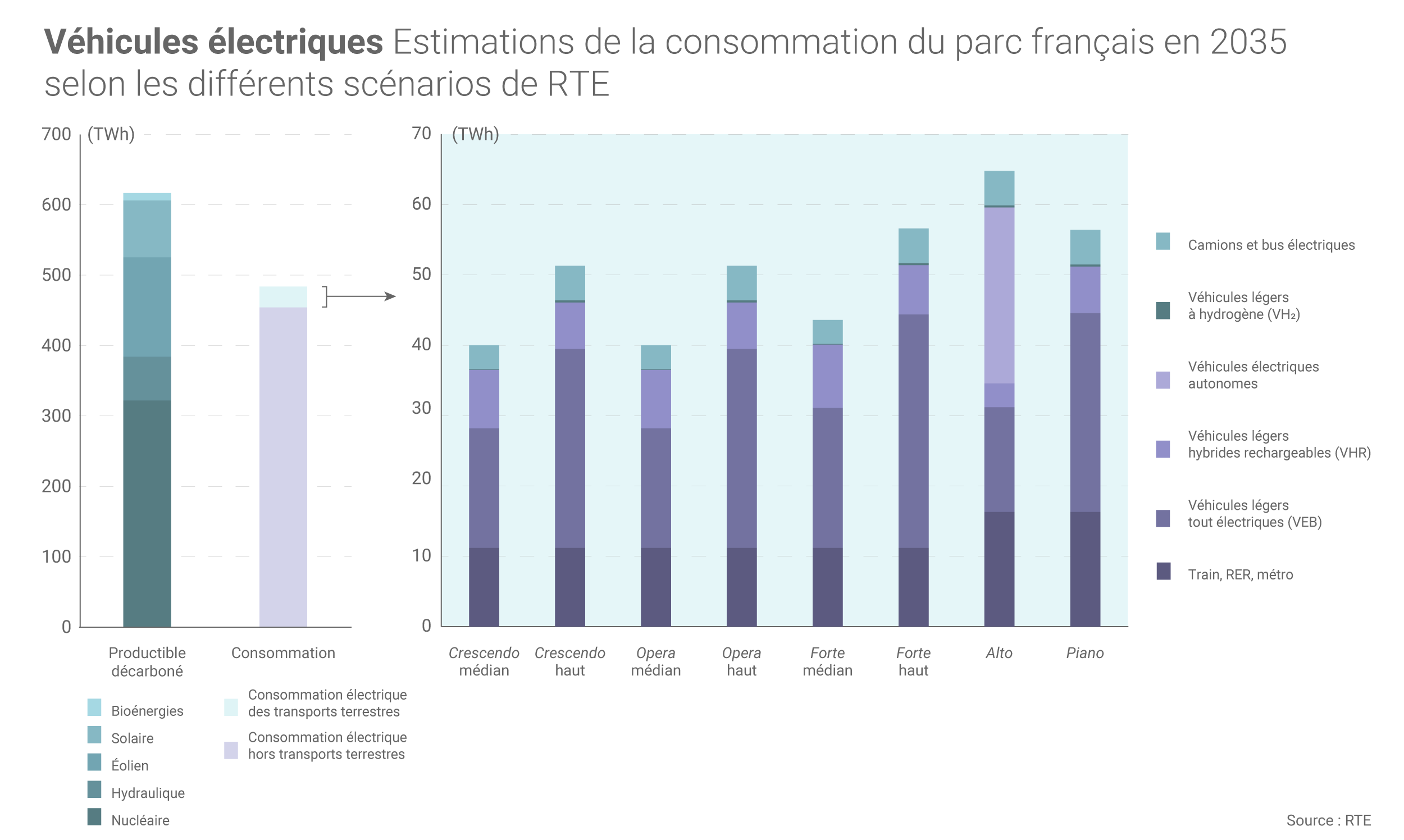 L’étude de RTE évalue les conséquences possibles pour le réseau électrique (et dans une moindre mesure les impacts économiques et environnementales) du développement à grande échelle des véhicules électriques en France, à travers 5 scénarios prospectifs : Crescendo (projections « standard »), Opéra (dans le cas d’un système électrique « très flexible »), Forte (système électrique en situation de « stress »), Alto (mobilité centrée sur le véhicule autonome partagé) et Piano (avec une part plus importante des mobilités dites « douces »).