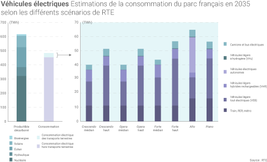 En cas de fort développement de l’électromobilité en France (parc de 15,6 millions de véhicules légers électriques en 2035), la consommation d’électricité induite est évaluée dans ces différents scénarios autour de 40 TWh par an(3) en 2035, soit « au plus un dixième de la consommation d’électricité totale en France » envisagée à cet horizon (à titre de comparaison, le chauffage résidentiel consomme à l’heure actuelle 44 TWh d’électricité par an). Dans ces conditions, « le parc électrique décrit par le projet de PPE est amplement suffisant pour couvrir ce nouvel usage » selon le gestionnaire de réseau.
