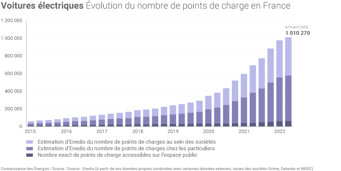 Selon les dernières estimations communiquées par Enedis, la France disposait de 1 010 270 points de charge en France à fin avril 2022, soit quasiment le double de leur nombre à fin 2020.
