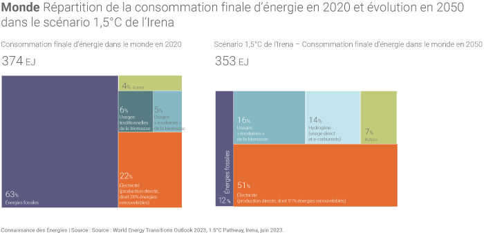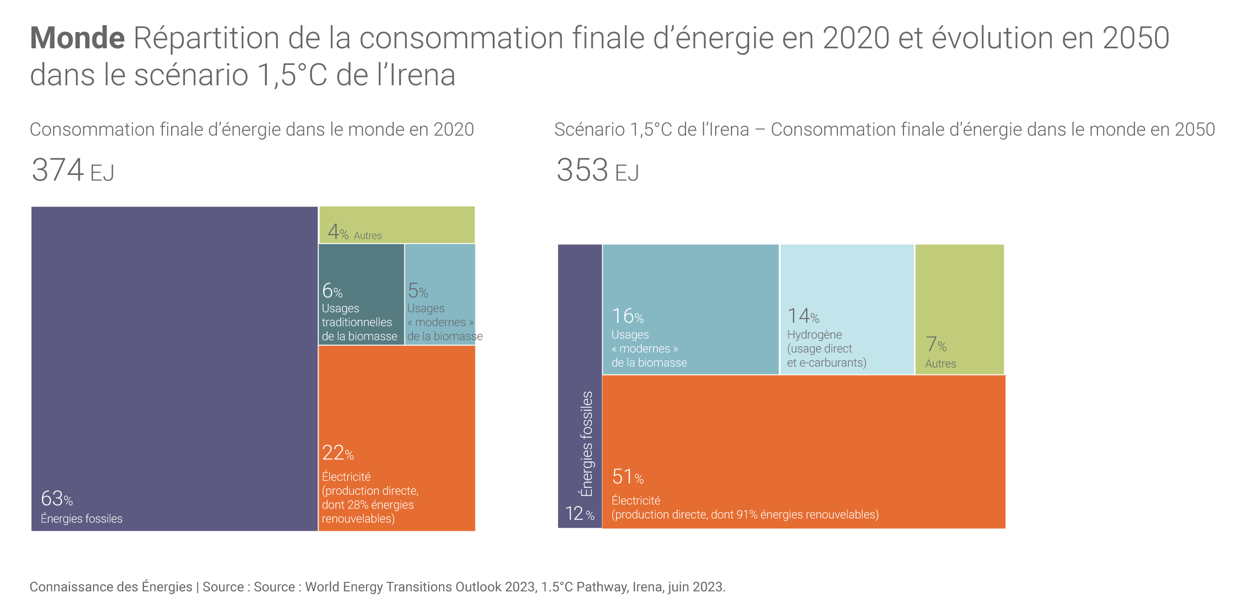 Pour rappel, l'Irena promeut un déploiement massif des énergies renouvelables et une électrification majeure de nos systèmes énergétiques : dans son scénario 1,5°C, l'électricité compterait en particulier pour 51% de la consommation d'énergie finale dans le monde en 2050 (contre 22% en 2020) et cette électricité serait produite à cet horizon à 91% par des filières renouvelables (contre 28% en 2020).